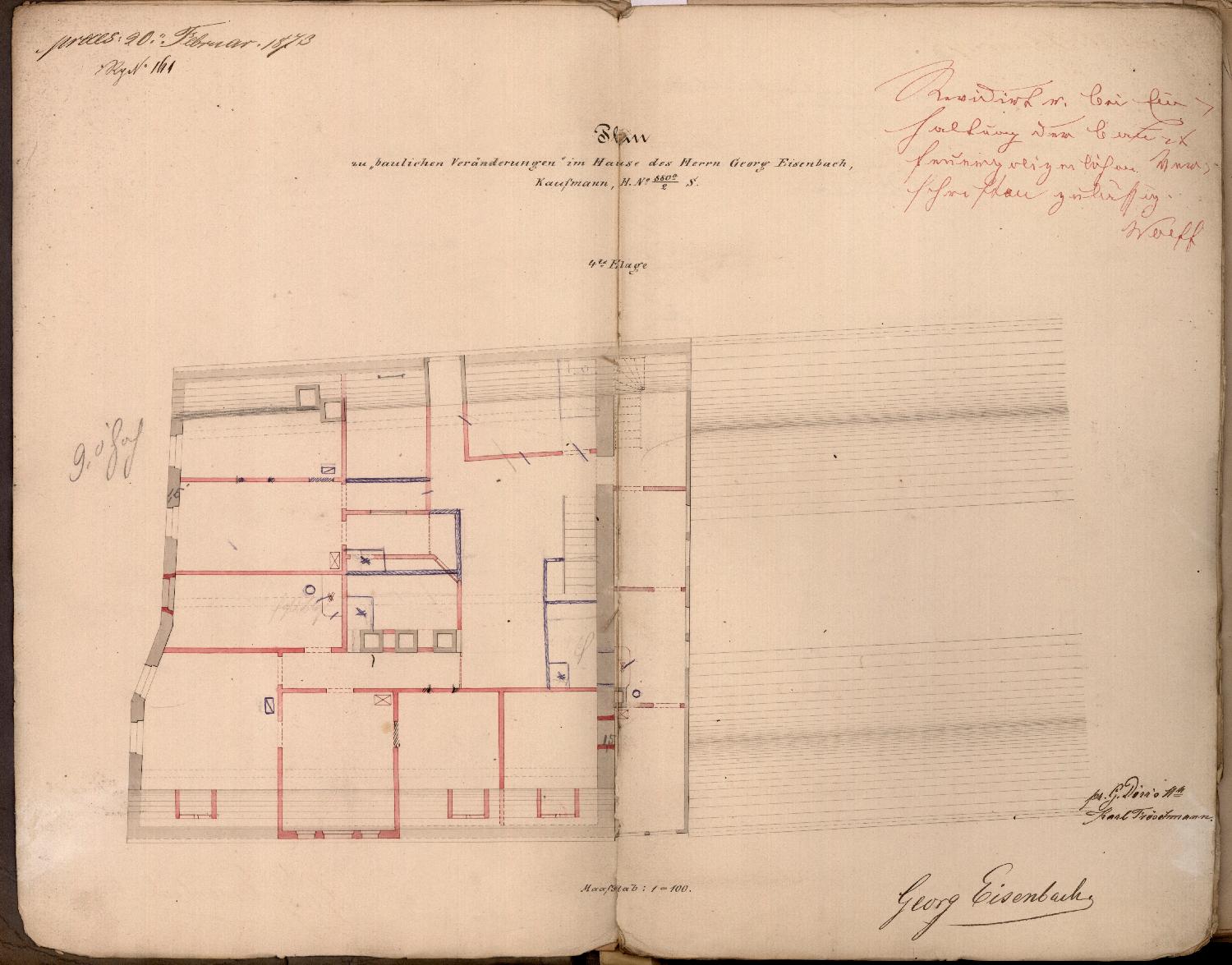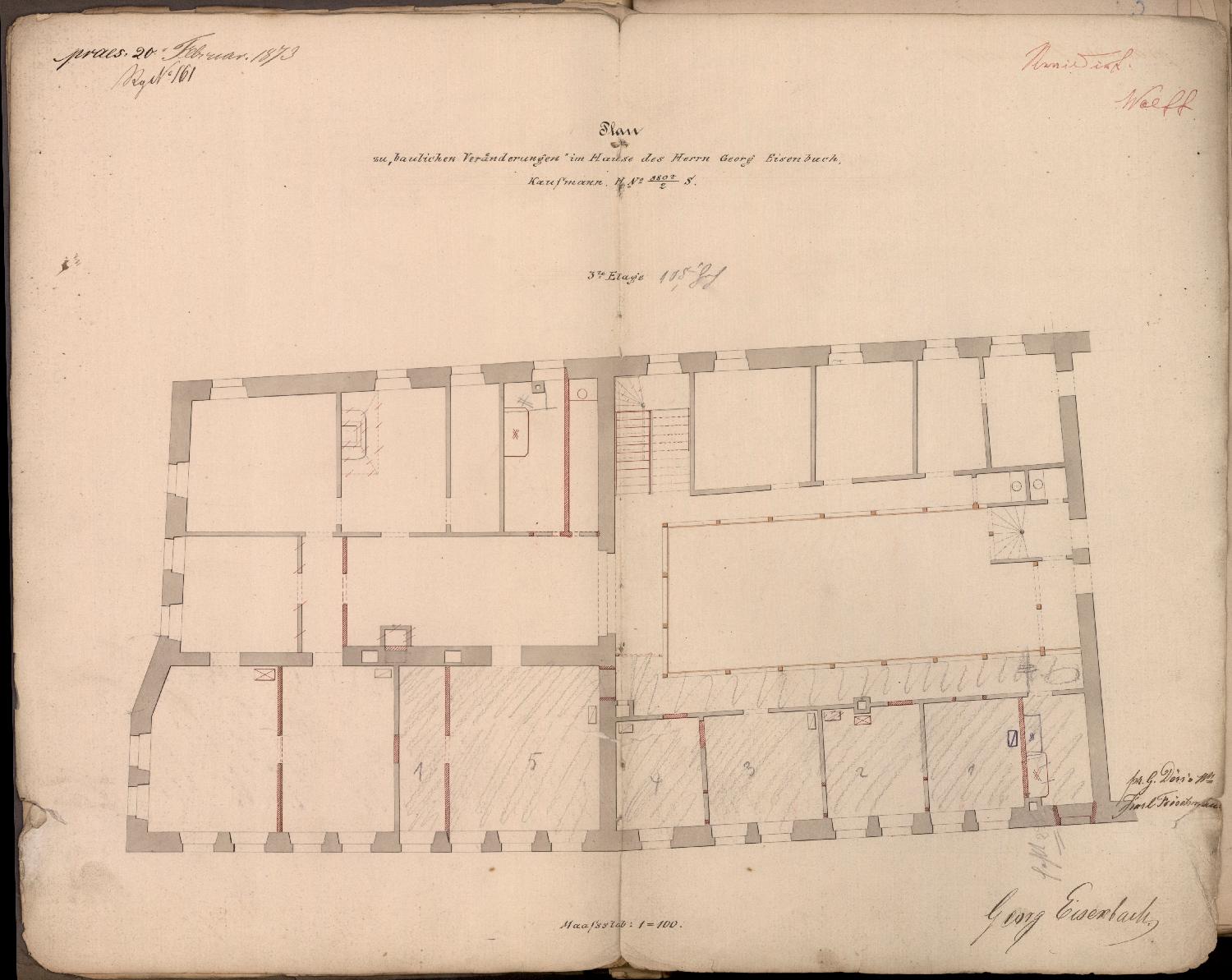 Polizeisenatsbeschluss (11. 3. 1873): Die im Haus des Kaufmanns Georg Eisenbach vorgesehenen baulichen Veränderungen werden genehmigt.