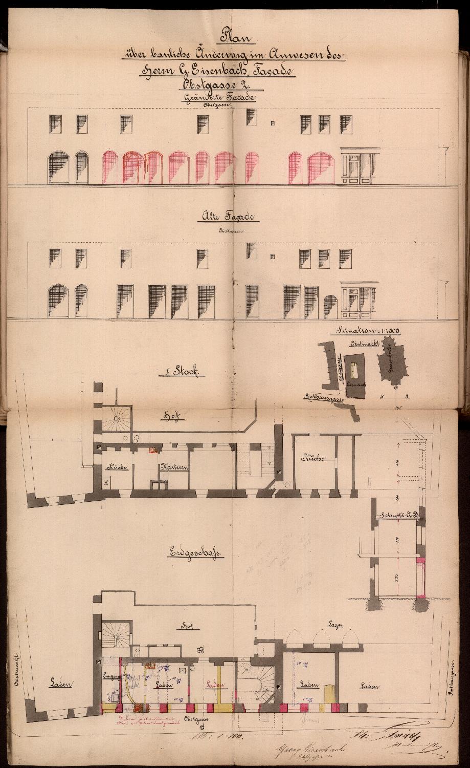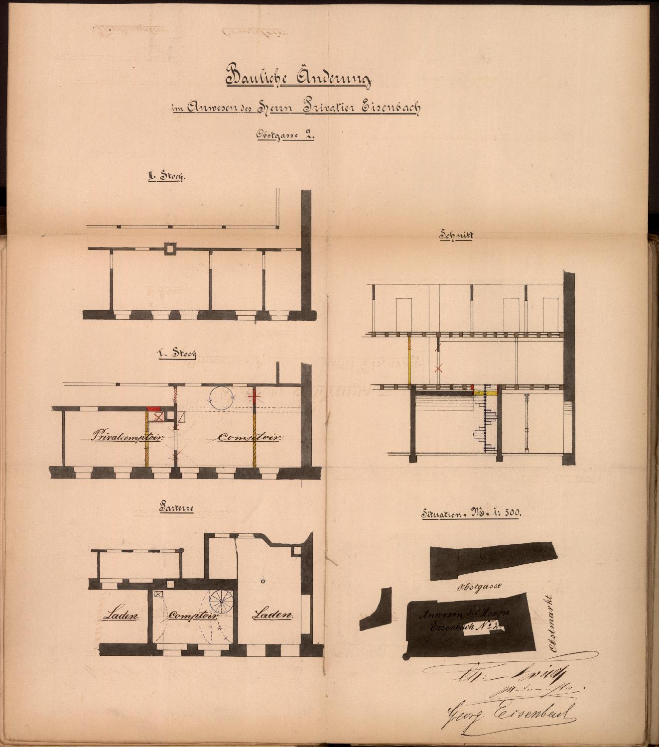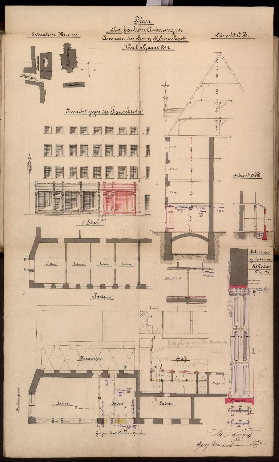 Dazu Zeichnungen des Maurermeisters Ch. Frisch: Lageplan, Teilaufrisse der nördlichen Seite des Gebäudekomplexes mit Darstellung von Erdgeschoss und erstem OG (Bestand und Planung), Grundrisse von Erdgeschoss und erstem OG des nördlichen Flügels, Schnitt. Im nördlichen Seitenflügel und dem daran grenzenden Raum des Vorderhauses sollen im Erdgeschoss mehrere Läden eingerichtet und dafür Grundrisse und Fassadenöffnungen verändert werden.