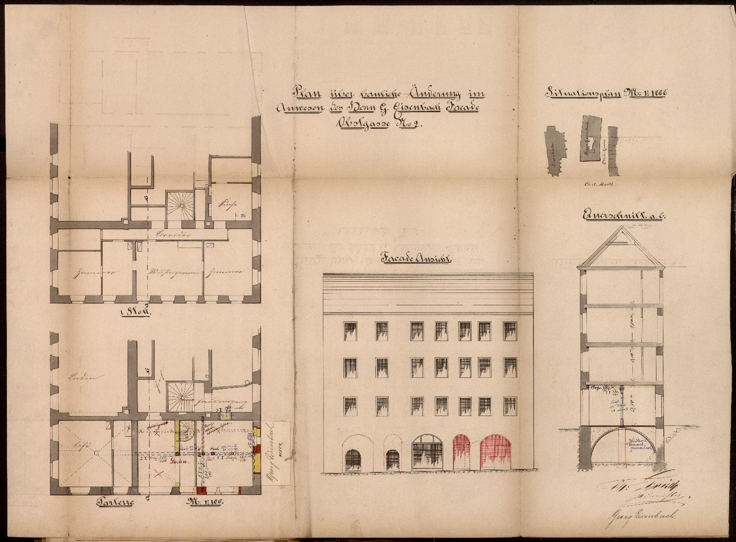 Dazu Zeichnungen des Maurermeisters Ch. Frisch: Lageplan, Teilgrundriss mit Darstellung eines Bereiches des Erdgeschosses sowie der ersten beiden OG, Teilschnitt. Ein im Erdgeschoss befindlicher Raum soll durch eine Windelstiege mit dem darüber liegenden Comptoir verbunden werden.