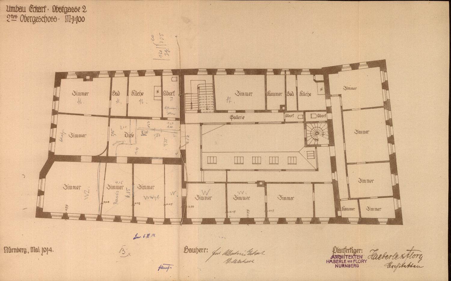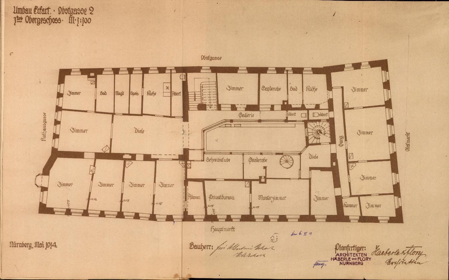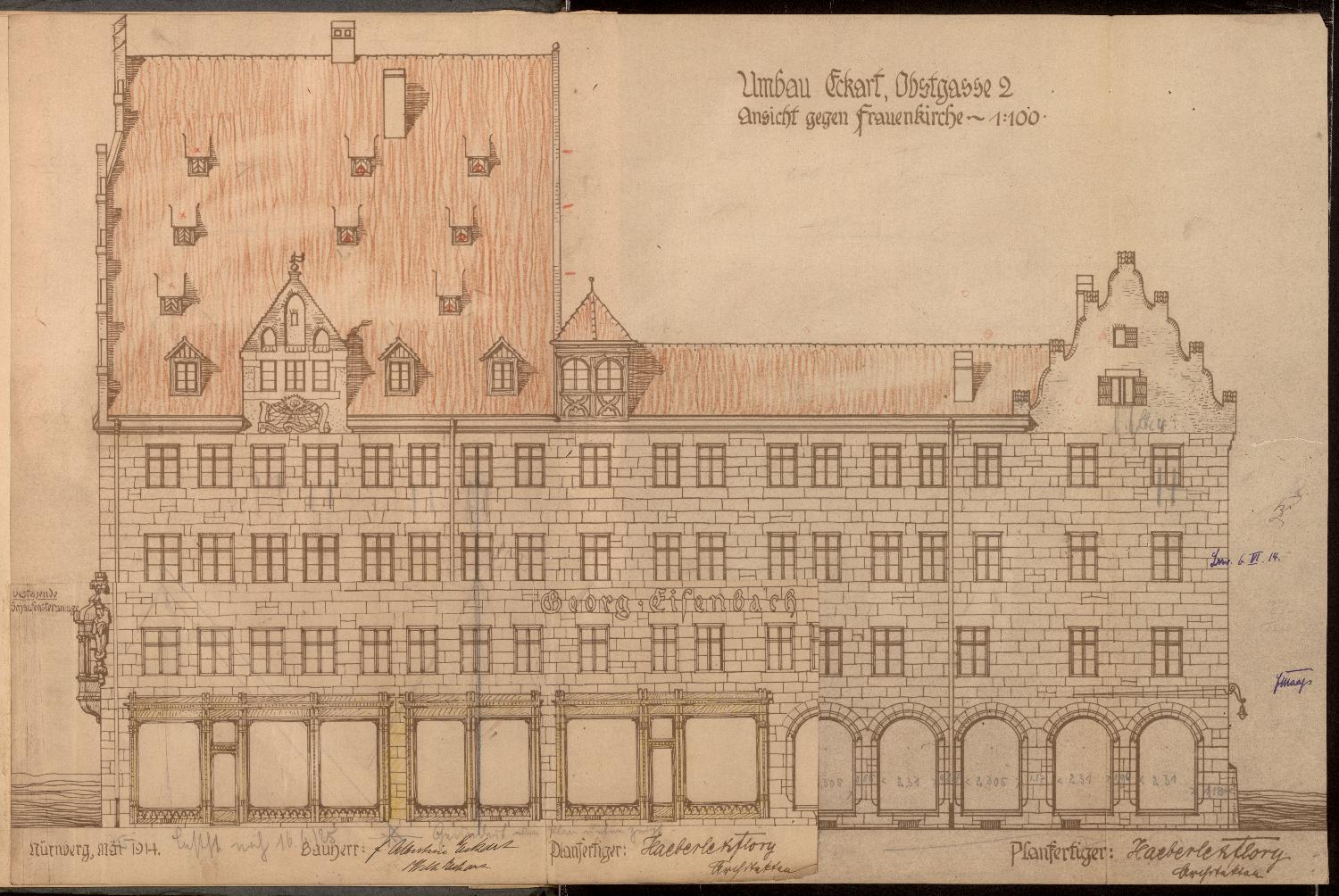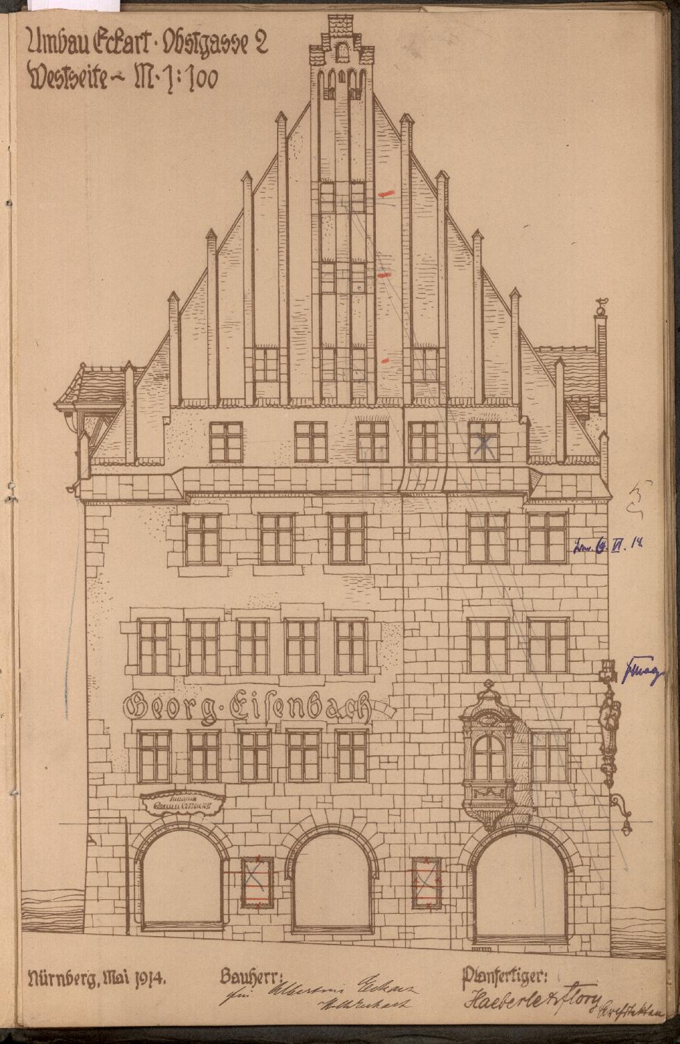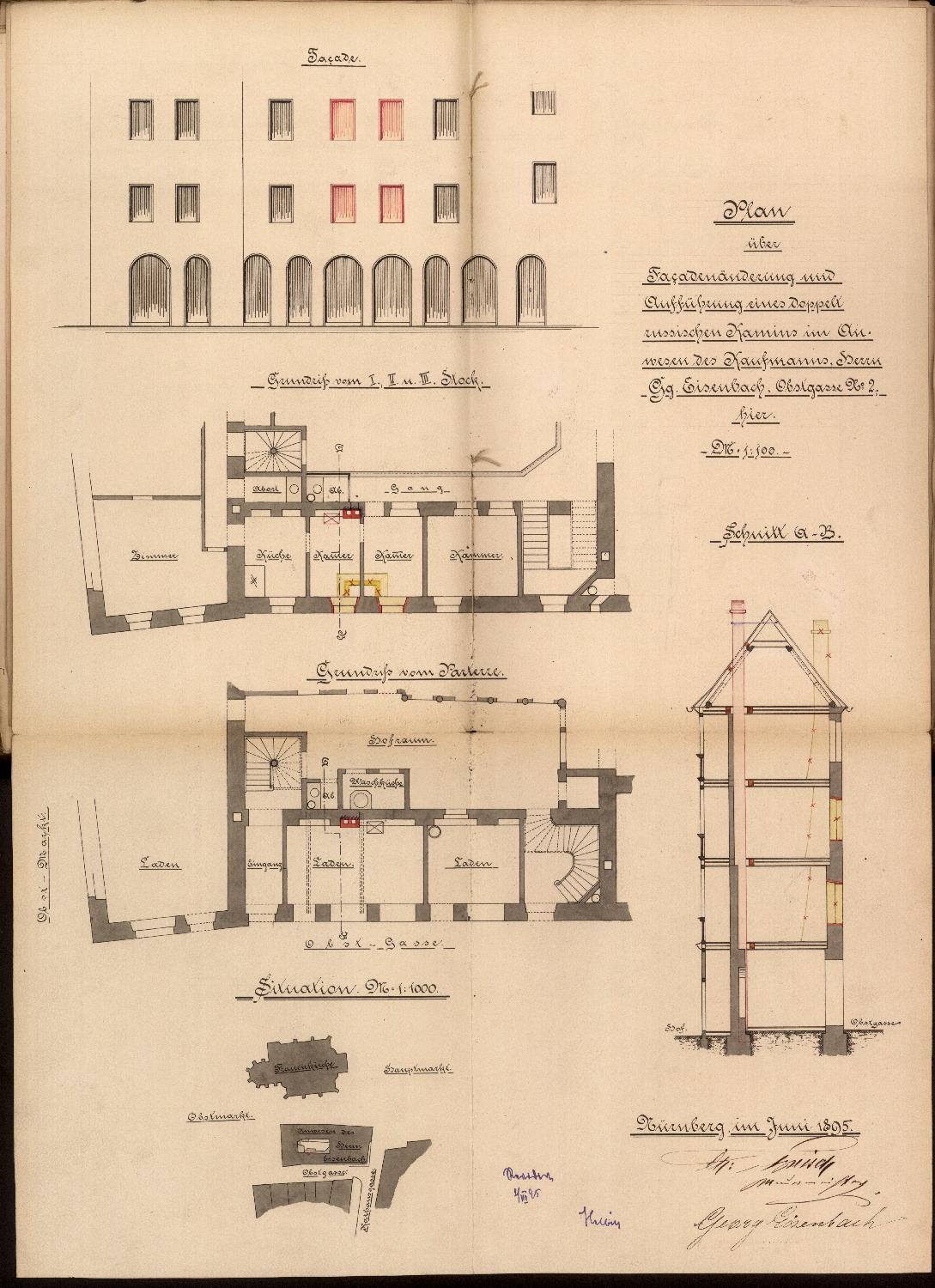 Protokoll, aufgenommen beim Stadtmagistrat Nürnberg: Für eine geplante Fassadenänderung sowie den Bau eines russischen Doppelkamins auf dem Anwesen des Kaufmanns Georg Eisenbach, Obstgasse 2, werden Pläne eingereicht.