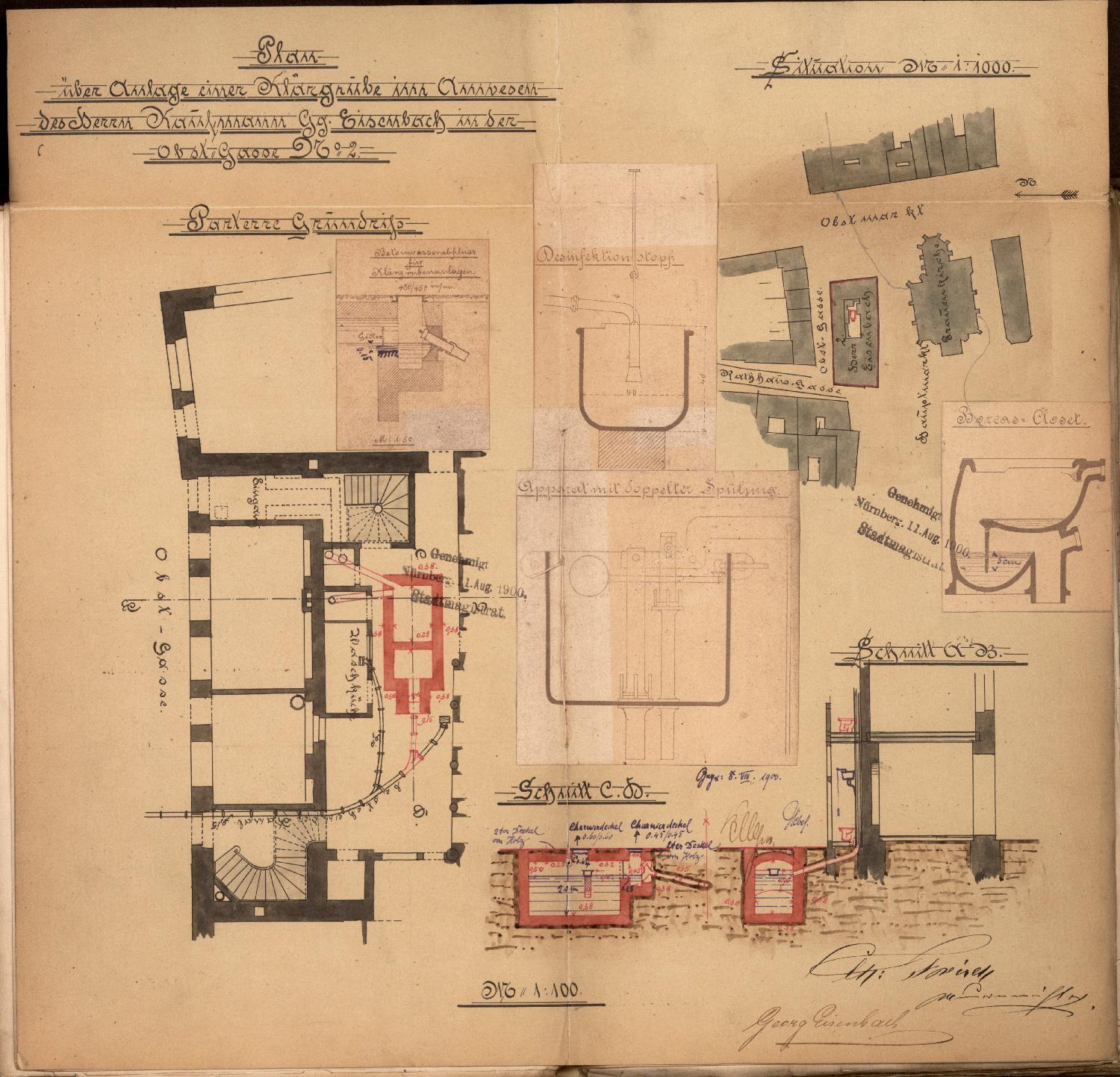 Protokoll, aufgenommen beim Stadtmagistrat Nürnberg: Für die Anlage einer Klärabortgrube auf dem Anwesen des Kaufmanns Georg Eisenbach, Obstgasse 2, werden Pläne eingereicht.