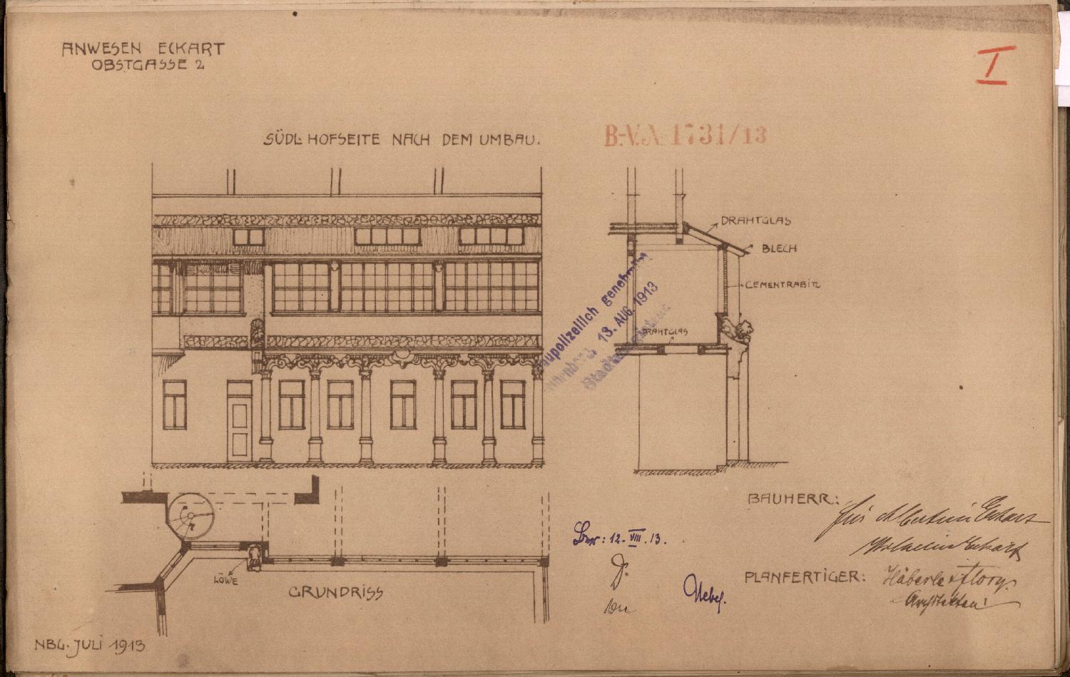 Vermerk (1. 10. 1913): Die notwendigen Pläne wurden am 1. Oktober 1913 eingereicht (2158/13).