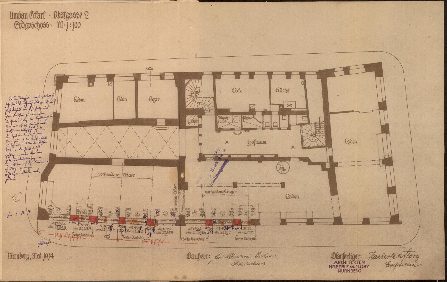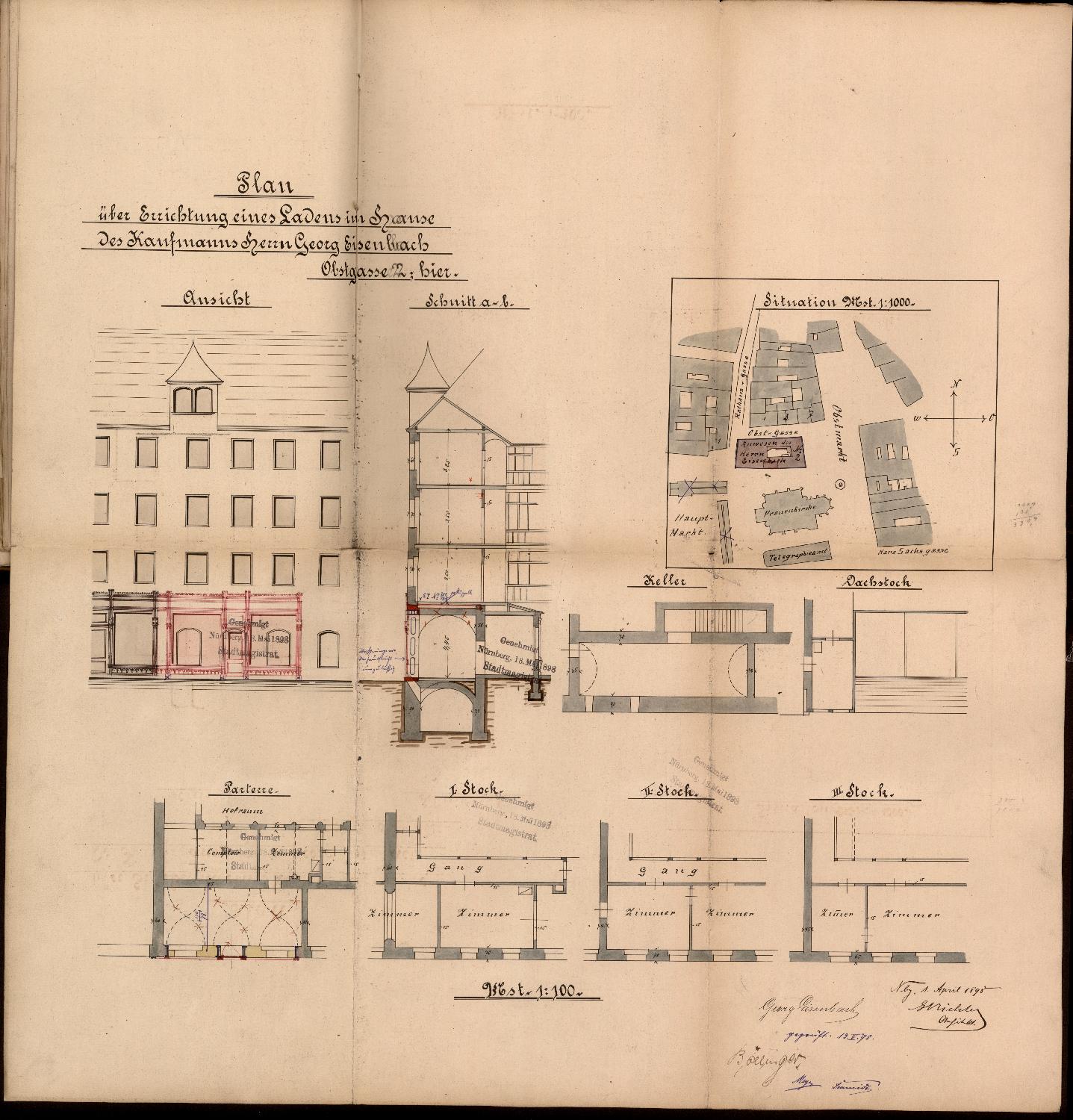 Protokoll, aufgenommen beim Stadtmagistrat Nürnberg: Für die beabsichtigte Einrichtung eines Ladens auf dem Anwesen des Kaufmanns Georg Eisenbach, Obstgasse 2, werden Pläne eingereicht.