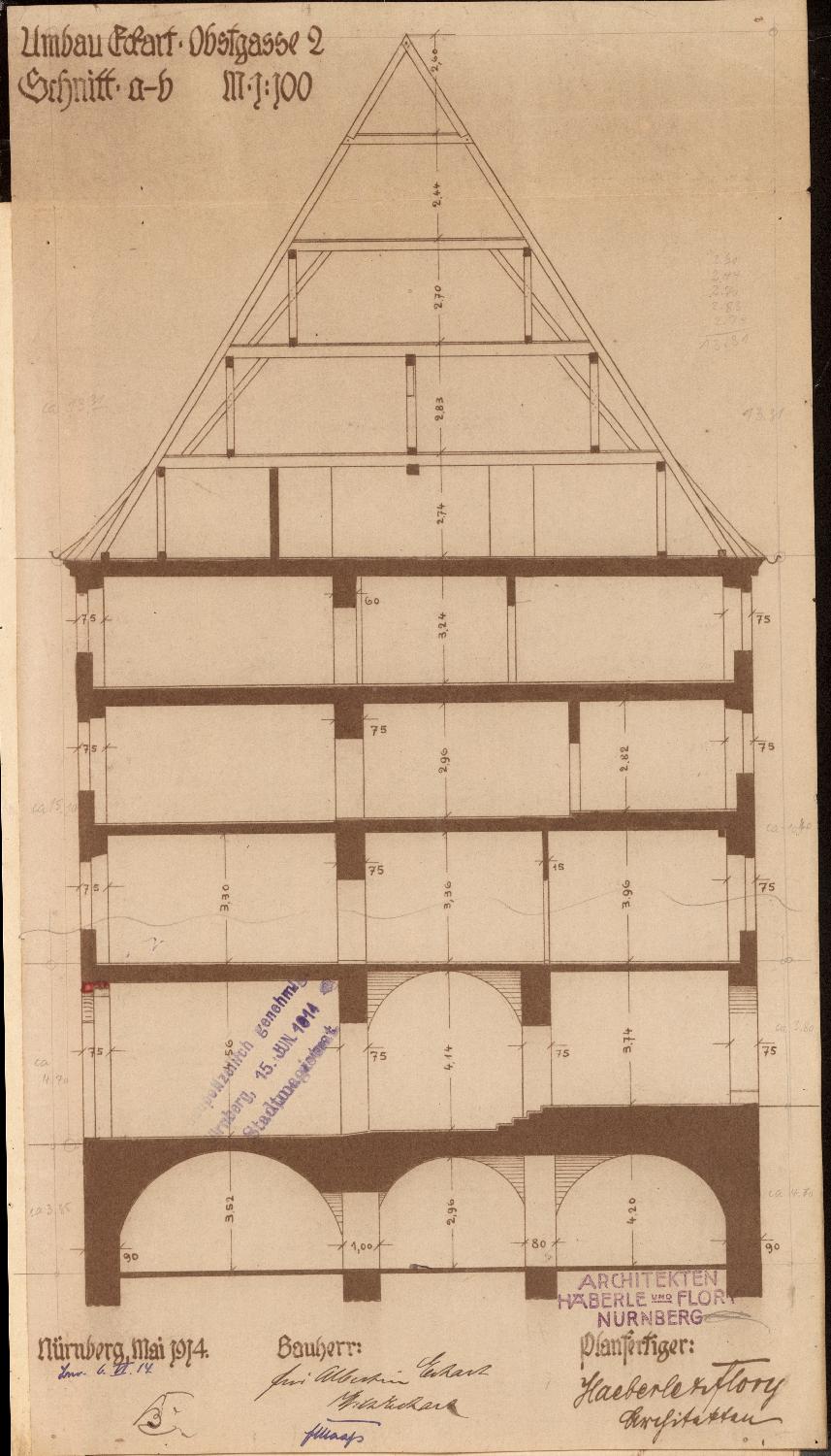 Schreiben der Architekten Hans und Otto Ebert (15. 12. 1938): Die Verfasser reichen anliegend die Pläne für den Einbau eines Laubenganges an der Westseite des Anwesens Obstgasse 2 ein. Um der allzu drastischen Reduzierung der Ladenfläche vorzubeugen, soll ein Teil des Hofes in die Geschäftsräume einbezogen werden. Allerdings ist die Hofarchitektur nicht ohne bau- und kunsthistorischen Wert. Daher wäre zu prüfen, ob eine teilweise Überbauung beziehungsweise Veränderung des Hofes zu verantworten ist. Die zu erwartenden Baukosten schätzen die Verfasser auf 100.000 Reichsmark.