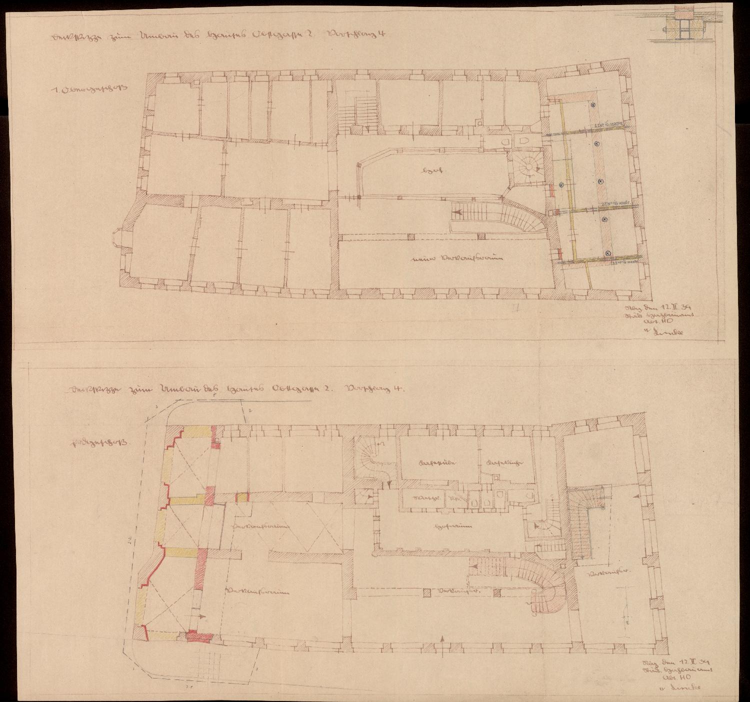 Zeichnungen der Abteilung HD (Lincke) wegen des in der Obstgasse 2 beabsichtigten Umbaus (12. 2. 1939): Grundrisse von Erd- und erstem Obergeschoss des Gebäudekomplexes. Die im Erdgeschoss gelegenen Ladenräume sollen durch Einbau eines Laubenganges an der Westseite verkleinert werden. Zur Kompensation war die Einrichtung von Verkaufsräumen im ersten Obergeschoss des am Obstmarkt gelegenen Hintergebäudes vorgesehen. In seinem Erdgeschoss befanden sich bereits Ladenräume. Auch im ersten Obergeschoss des südlichen Seitenflügels sollten Verkaufsräume entstehen.