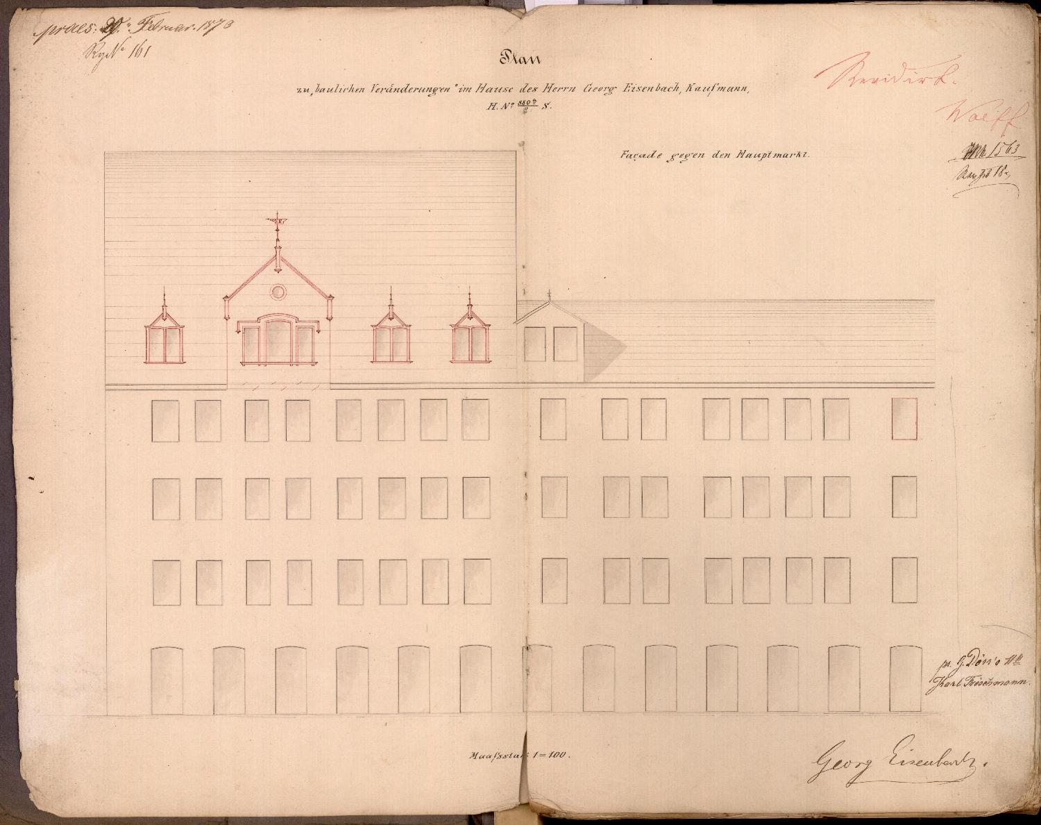 Vermerk über Wiedervorlage wegen der Veränderung der Fassade am Haus des Kaufmans Georg Eisenbach [S 880 a-b] (30. 12. 1874) - dazu: Vermerk (4. 1. 1875): Die Veränderungen wurden nicht ausgeführt. Die entsprechende Baugenehmigung ist seit dem 16. 12. des vergangenen Jahres erloschen.
