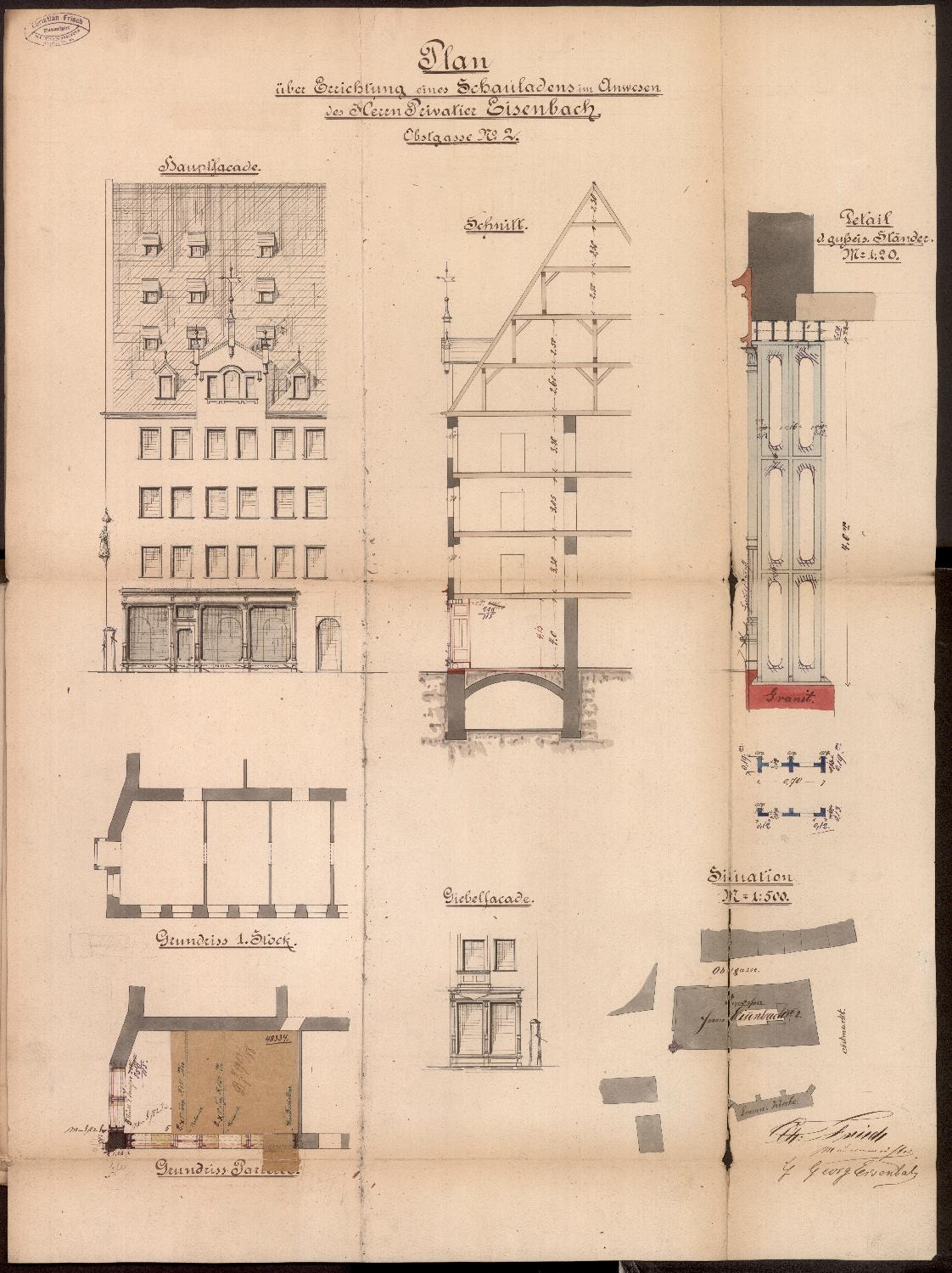 Dazu Zeichnung des Maurermeisters Ch. Frisch: Lageplan, Aufriss der südlichen sowie Teilaufriss der westlichen Fassade des Vorderhauses, Schnitt, Teilgrundriss des Erdgeschosses sowie des ersten OG des Vorderhauses mit Darstellung des südwestlichen Bereiches, Detailzeichnungen. Der größte Teil der südlichen und ein Bereich der westlichen Fassade soll mit einer Verkleidung und neuen Schaufenstern beziehungsweise Ladentüren versehen werden.
