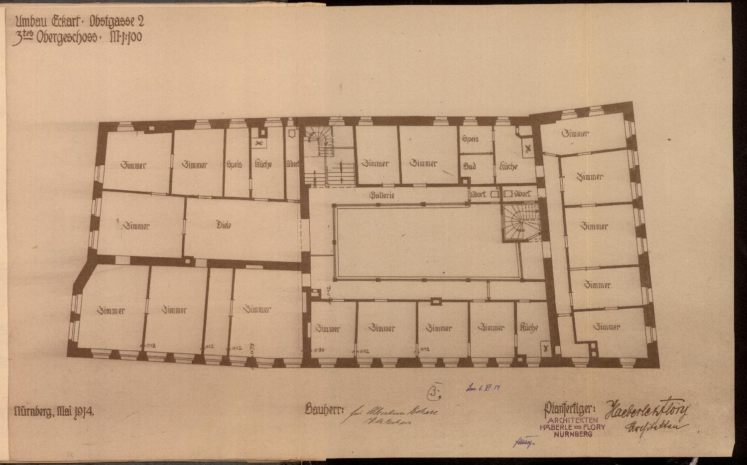 Schreiben des Architekten Otto Ebert wegen der in der Obstgasse 2 vorgesehenen Laubengänge (19. 11. 1938). Wegen der Angelegenheit wurden mündliche Vorverhandlungen mit dem Nürnberger Hochbauamt aufgenommen und erste Skizzen vorgelegt. Die eigentlichen Pläne sowie die notwendigen Kostenvoranschläge sind allerdings noch in Arbeit.
