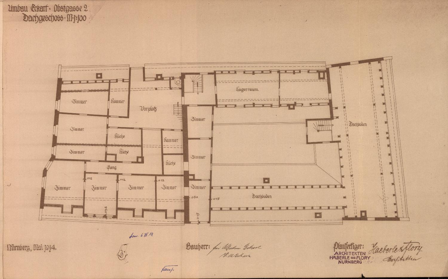 Vermerk: Die auf dem Anwesen Obstgasse 2 beabsichtigten baulichen Veränderungen sind nach Maßgabe der Pläne 1939/12 und 3237/12 ausgeführt worden.